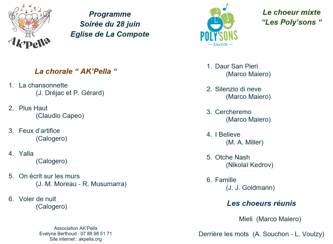 La Compôte en Bauges du 28 juin 2025 1ère partie : Ak’pella 2ème partie : Poly’sons 3ème partie : Chants communs
